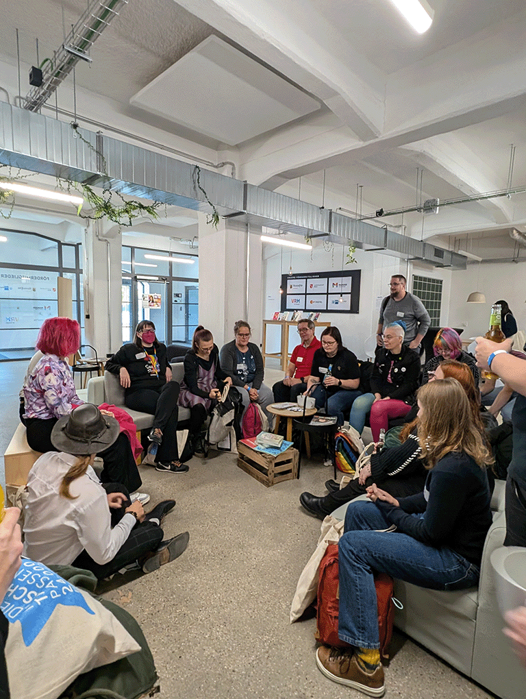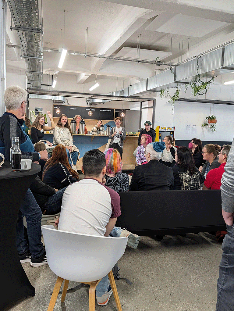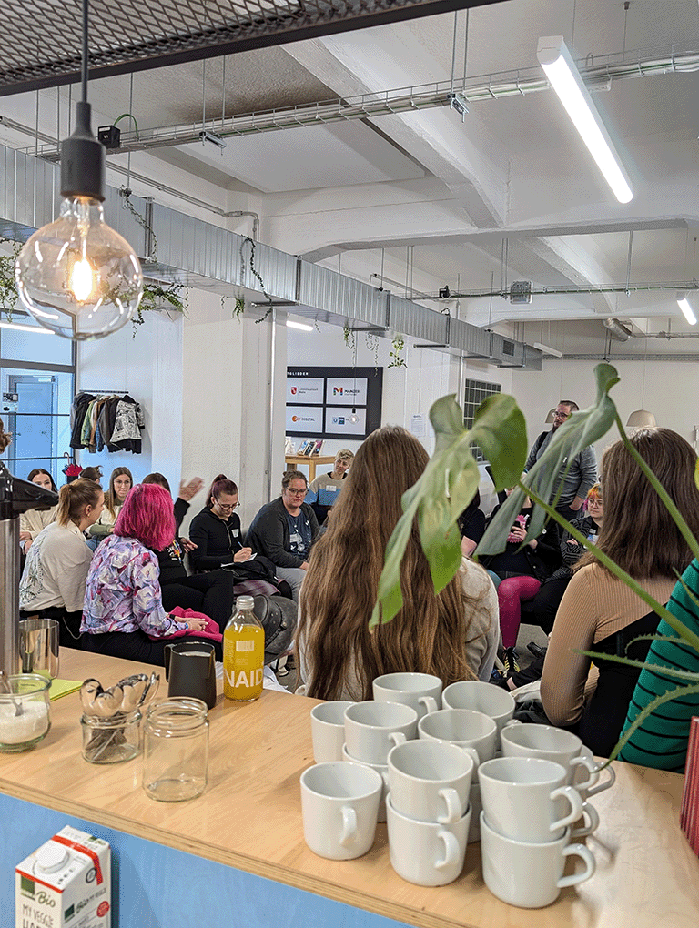 Wie wir dann am nächsten Morgen feststellten: Waschechte Autor*innen brauchen keinen Schlaf. Die ersten Schreibfans sammelten sich bereits 20 Minuten vor Einlass vor den Türen des Hubs – eifrig, bester Laune und mit neuer Energie. Und für alle, die doch noch mit einem schlafenden Auge bei der Sache waren, gab’s den morgendlichen Kaffee zum Munterwerden. So konnten alle gemütlich auf der einladenden Community-Fläche des Hubs in ihren Tag finden.