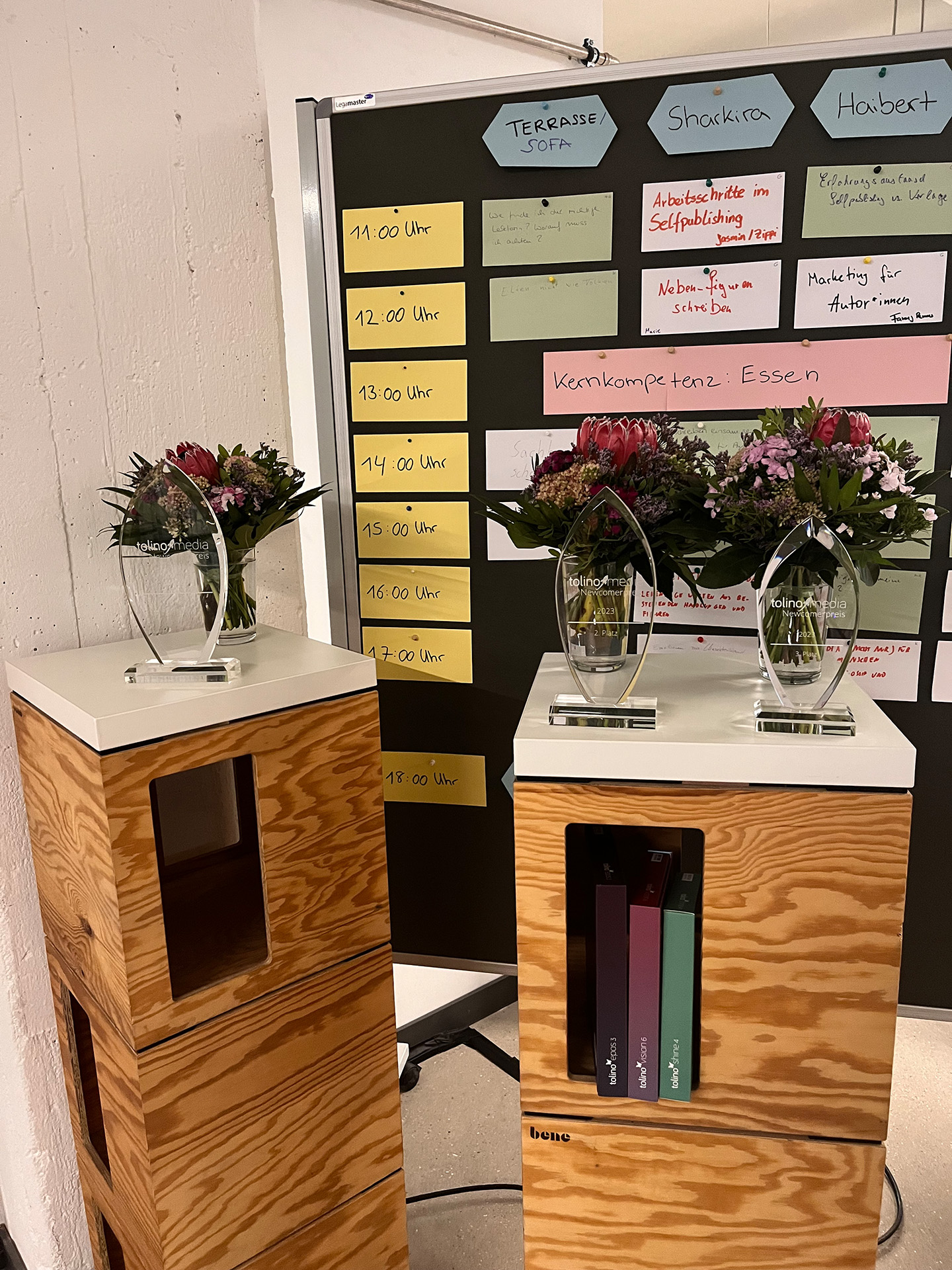 Bei einem BarCamp macht ihr selbst das Programm. So auch beim SchreibBarCamp by tolino media. Nach der Vorstellungsrunde kam jede*r der/die eine Session anbieten wollte nach vorne und stellte sein Thema kurz vor. Von „Arbeitsschritte im Selfpublishing“ über „TikTok für Autor*innen“ bis hin zu „Wie bändige ich meine Figuren“ war alles dabei. In der Fotostrecke findet ihr ein Bild vom gesamten Sessionboard.